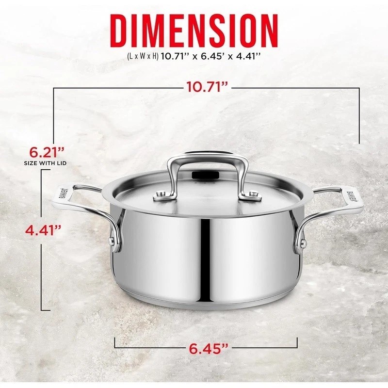 SIZE INFORMATION – Suitable for home cooking and large crowds, our stainless steel stock pot measures 10. 71 inches long x 6. 45 inches wide x 4. 41 inches wide and has a 2 quart capacity. The thick base measures 0. 157 inches and a weight of 2. 47 lbs including the lid. The inside of the stockpot features measurements for convenience when cooking.