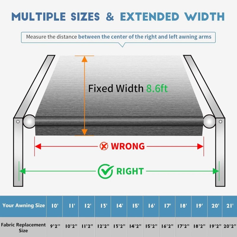 - UNIVERSAL FIT - Our RV awning fabric replacement comes in multiple sizes from 10ft to 21ft (fabric 9'2''-20'2''), with a fixed fabric width of 8.6 ft(including the valance part), ensuring perfect fit and full extension for your awning. It's compatible with most manual and electric awning brands like Carefree, Dometic, Lippert, etc. Please measure the distance between the two awning arms to select the suitable size