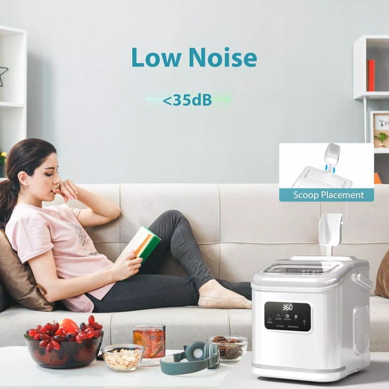 Fast ice making with low noise: 9 ice cubes can be made in 6 minutes at the earliest, a round of ice-making time is about 6-13 minutes. Within 24 hours, 26 pounds of ice can be made. The noise during ice making is lower than 35 dB and it can run quietly