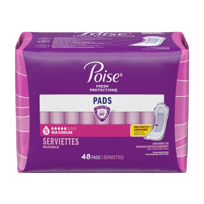 - POISE INCONTINENCE PADS: 48 incontinence and postpartum bladder leak pads, 5 Drop Maximum Absorbency, regular length (48 pads total)