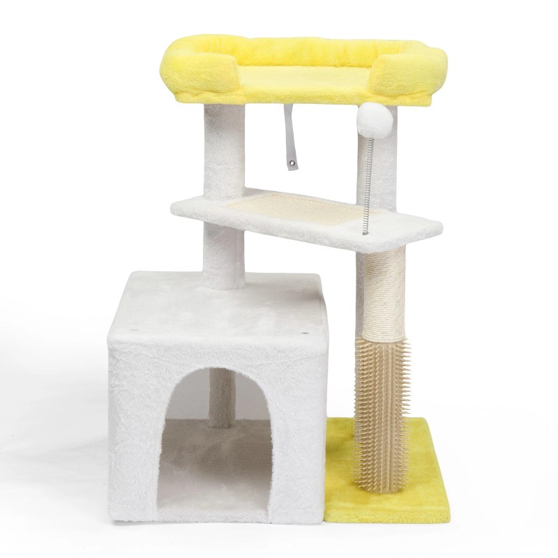 Give your feline friend a cheerful and cozy haven with this multi-level cat tree. Combining comfort and functionality, this cat tower includes a private condo, sisal-covered post and board for scratching, a soft top perch, and a playful hanging toy ball. Perfect for lounging, climbing, scratching, or simply observing from above, it offers a complete activity center in a compact, modern design. Built with sturdy materials and stylish color tones, this cat tree makes a beautiful addition to any indoor space while keeping your cat entertained and relaxed.