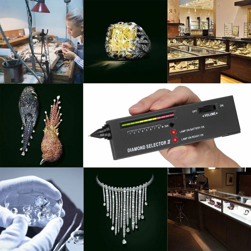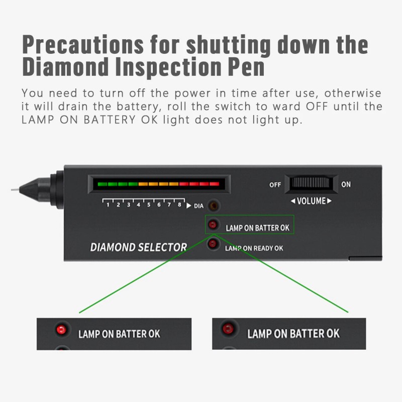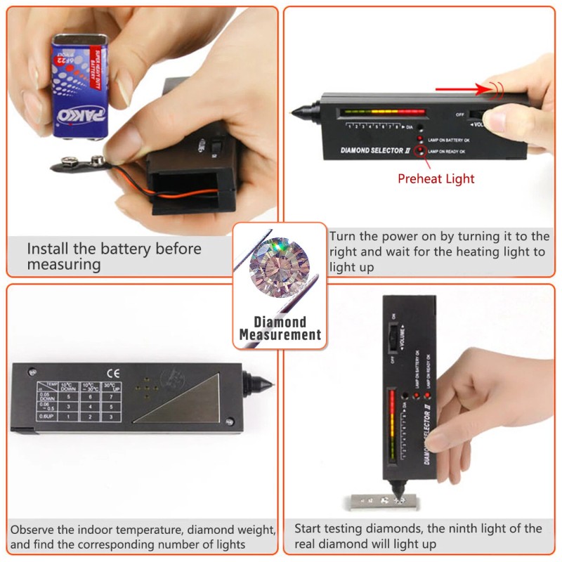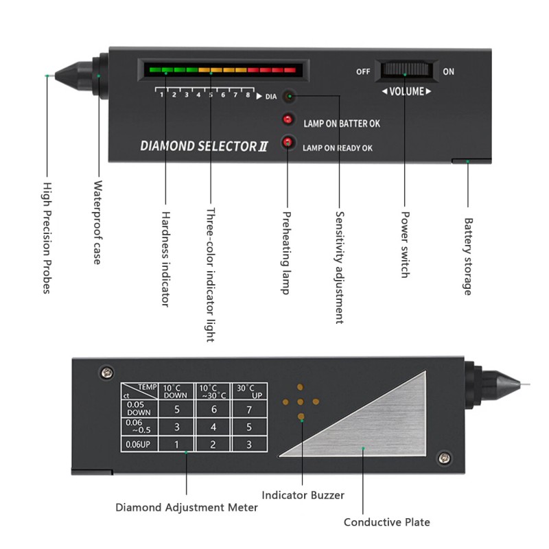 【Intuitive Design】Professional Diamond Selector II will indicate genuine diamond or fake. The real diamond will make sound and LED light > = 9. Fake crystal, such as cubic zirconium ( CZ ), crystal, glass will be no sounds and LED lights <9.