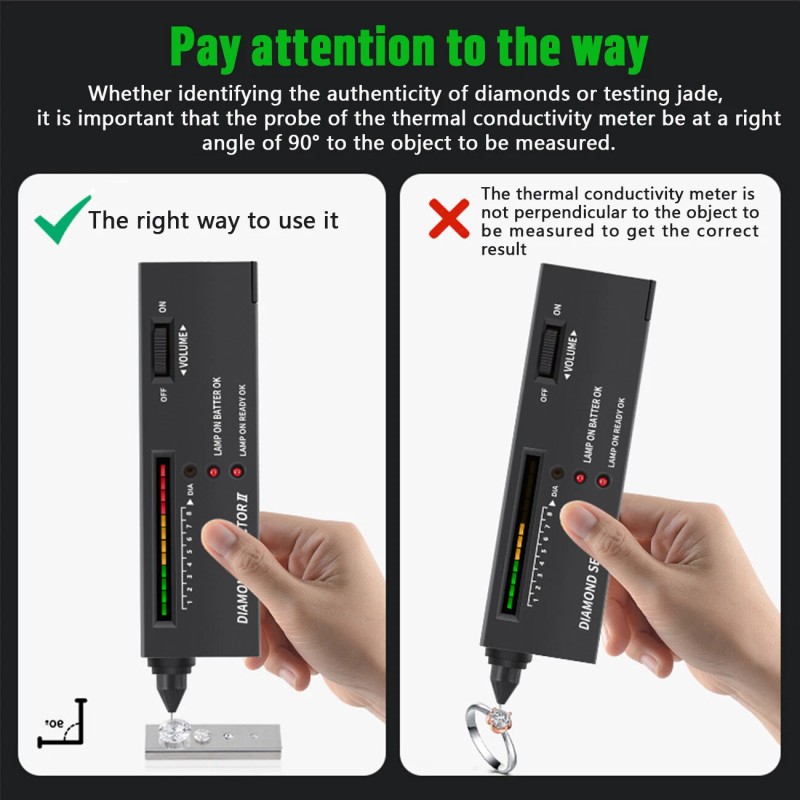 【Simple Use】The diamond tester pen is simple to operate to get results. Just adjust to the appropriate gear, put the tip of the diamond tester on the diamond and press it gently. When testing, the probe needle and the tested object must be at a 90°angle.