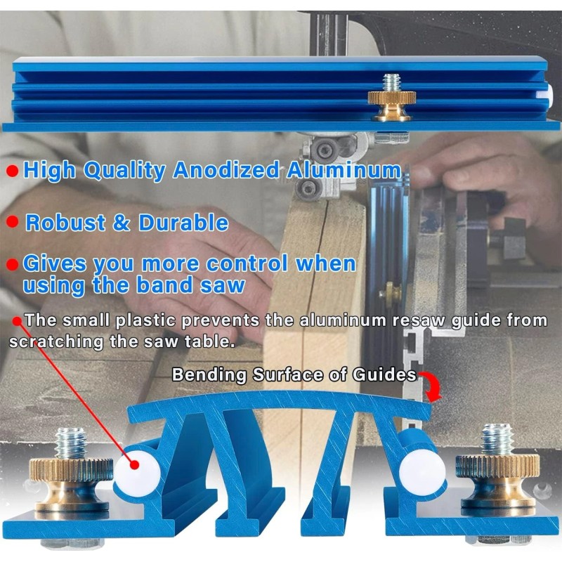 - Material: KMS7214 7 "resaw guide is made of high quality anodized aluminum, which is strong and durable. Gives you more control when using the band saw. The small plastic prevents the aluminum resaw guide from scratching the saw table.