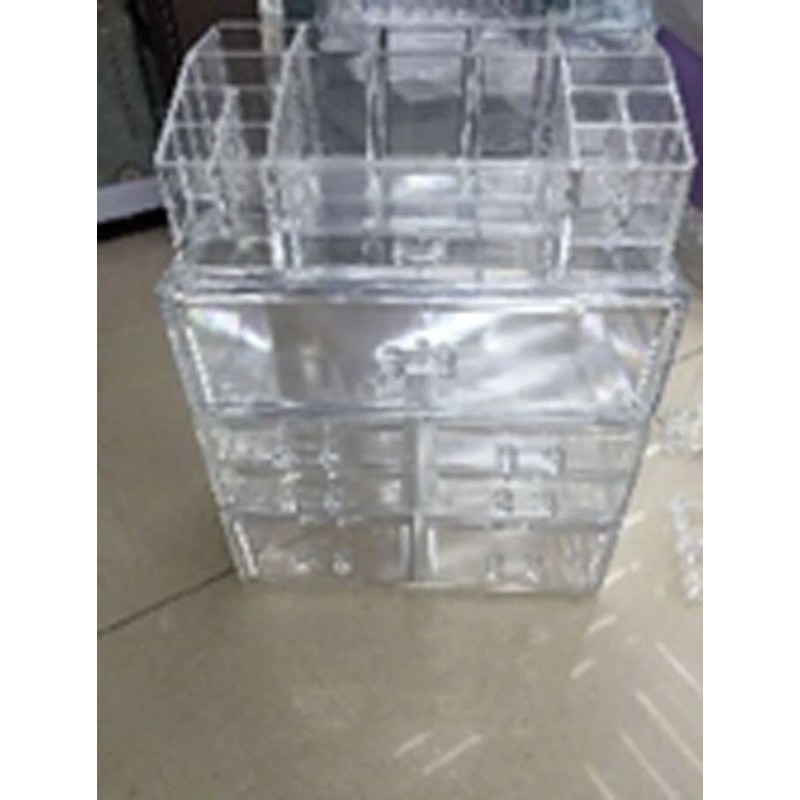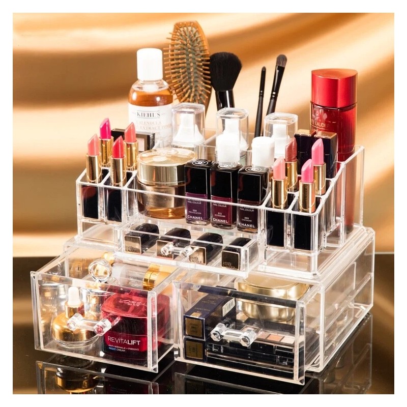 This 2-Piece Storage Case shown as pic #1 is the perfect way to manage your product obsession or large makeup stash! With a crystal-clear design, it features six drawers (both deep and small) and top tray compartment with fifteen divided slots. Simply fill this organizer with for your favorite cosmetics, skincare, and accessories. The interchangeable design can remain stacked together or used separately to spread out your collection. For convenience, you’ll always see your products right when you need them most while adding a chic display to your vanity.(Makeup NOT INCLUDED).