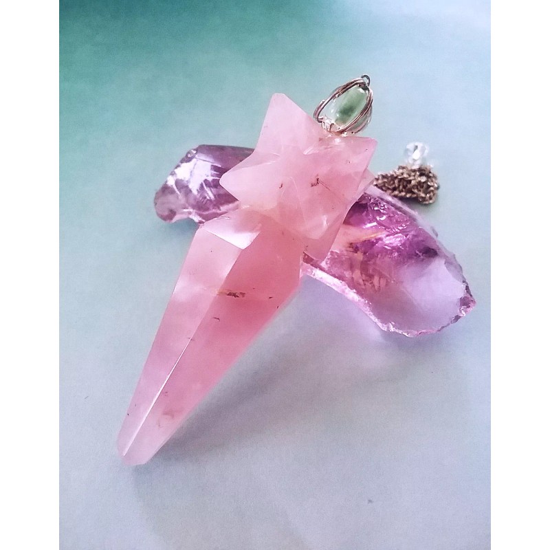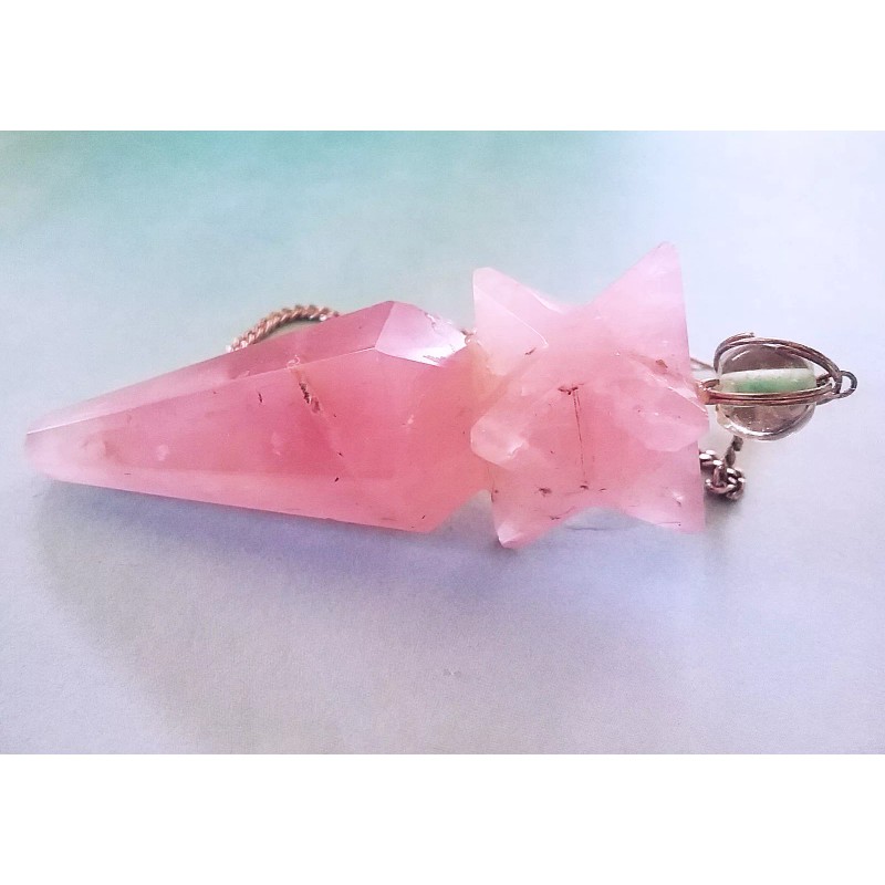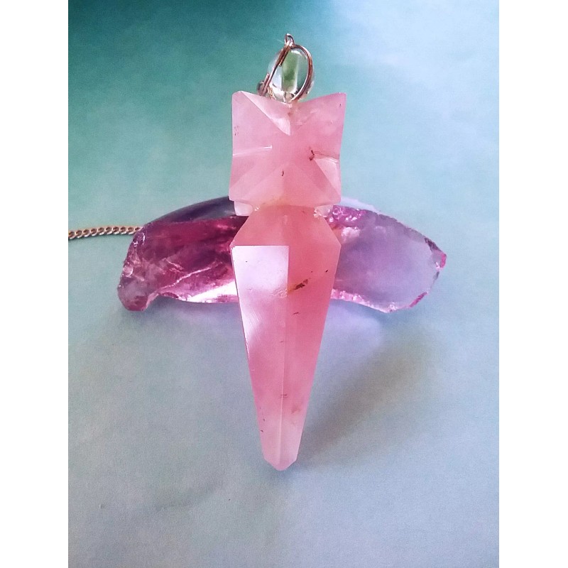 A large rose quartz pendant that measures approximately 2.5" in length. Includes a 20" silver chain with lobster clasp closure. It's a 3 part pendant. At the top is a crystal sphere, then there is a rose quartz merkaba, and below that is a 6 faceted rose quartz tapered point. As many geometric shapes as possible are in this pendant for extra accuracy.
