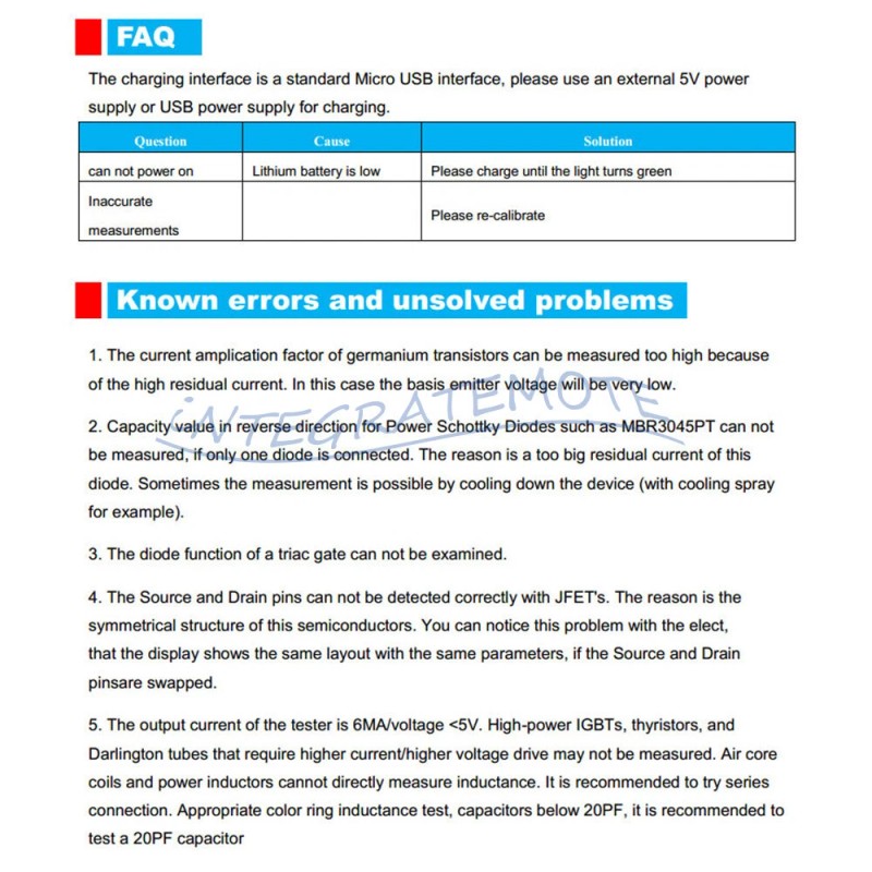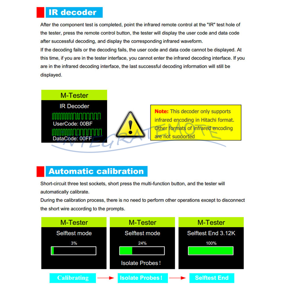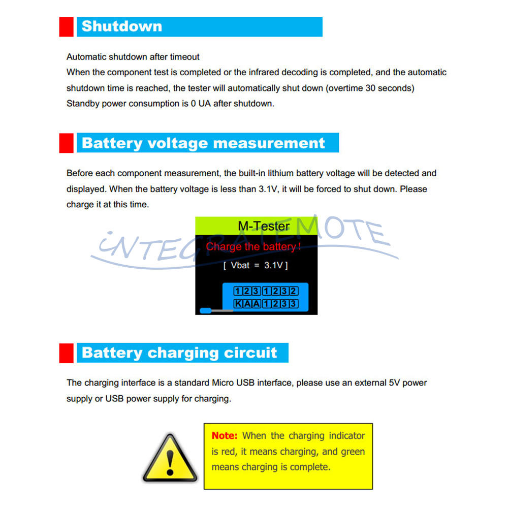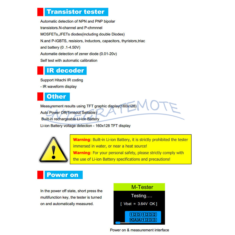 Warning: Built-in lithium-ion battery, forbidden to immerse the tester in water or close to a heat source!