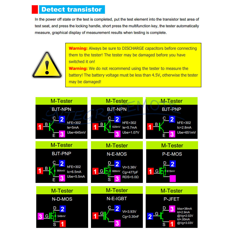 Warning:Always download the capacitor before connecting to the tester! The tester may be damaged before powering on.