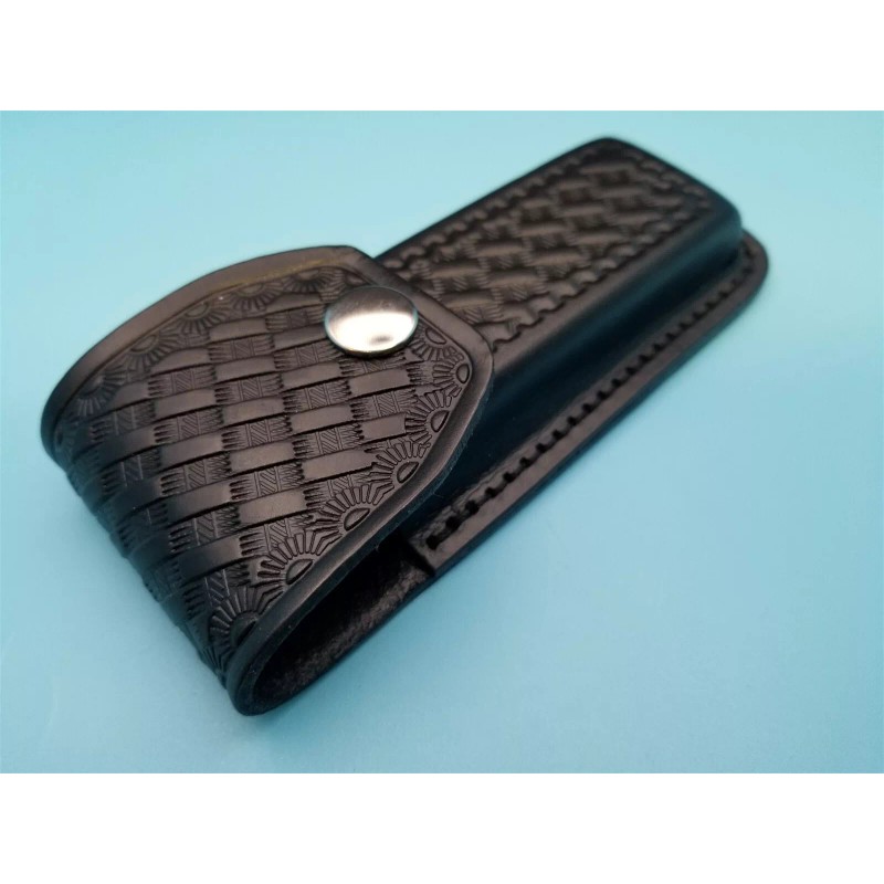 Sheath Folding Knife. Black leather with embossed basketweave design. Fits folding knives 4 1/2" to 5 1/4" closed.