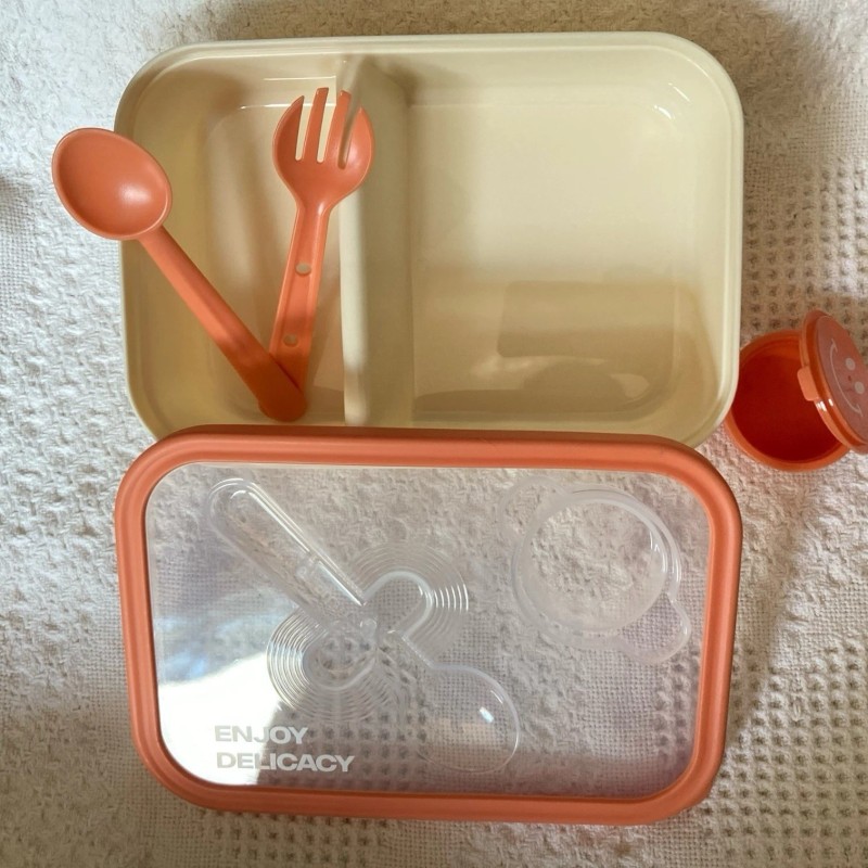 Lot of 3 new orange bento boxes with salad dressing containers and spoon & fork. The lot contains two single layer bento boxes which have two internal compartments as well as the sauce container on top. Its dimensions are 8.07” long by 5.59” wide by 2.56” deep. This holds up to 4 cups of food. The lot includes one double layer bento box with sauce container. The double layer has 4 internal compartments as well as the sauce container. It holds over 5 cups of food. The double bento box measures 8.07” long by 5.59” wide by 3.35” deep. These are all new. Microwave and dishwasher safe. BPA free. They come from non-smoking home.