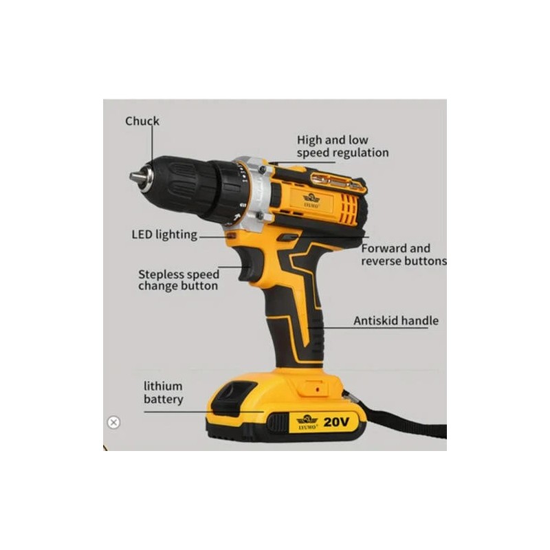 Tackle everyday repairs and DIY projects with the LYUWO 20V Cordless Drill. Powered by a 2.0Ah lithium-ion battery, this lightweight drill/driver delivers reliable torque, dual-speed control, and forward/reverse rotation for drilling and fastening. An integrated LED light brightens dark work areas, while the included driver bits help you get started right out of the box. Perfect for home repair, furniture assembly, yard maintenance tasks, and a practical gift for DIYers.