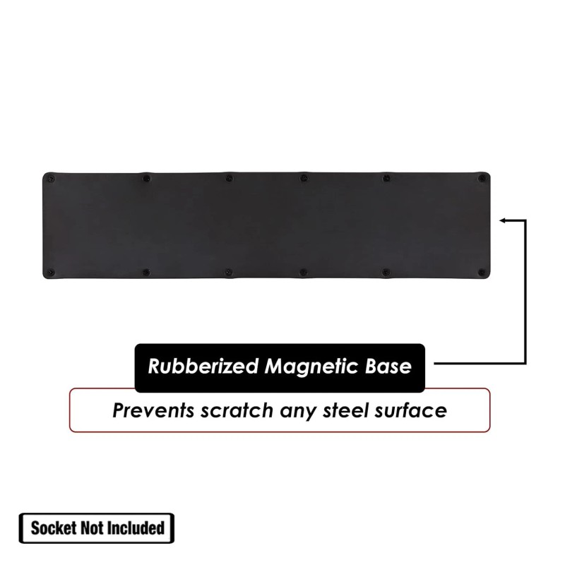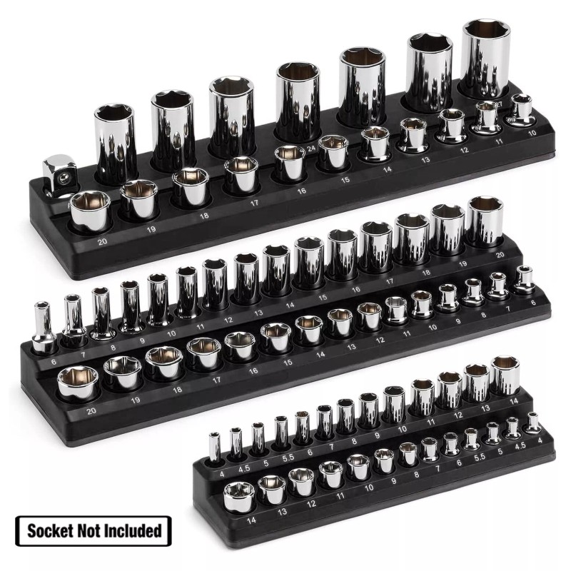 Magnetic Socket Organizer Set 3PC Socket Holder Set 1/4"3/8"&1/2"Drive Large Capacity Magnetic Socket Organizer Set: These magnetic socket organizers can store up to 75 metric sockets. The kit includes three black metric magnetic socket organizers for 1/4", 3/8" and 1/2" drives. They collect metric receptacles but not for impact sockets. Tip: sockets are not included with the holders. Magnetic Base: The magnetic base secures the sockets in their designated places. They won't fall out even if you turn the socket tray upside down. They also allow you to attach the tray to any steel surface. No scratches Installation: The surface of the magnetic base is composed of soft rubber, so there is no need to worry about scratching the surface of your metal tools and sockets, perfect fit for your toolset. Keep Your Sockets Organized: Find the right socket quickly and easily with this magnetic socket holder set. Each tray has a legible label, so you can tell which slot to grab instead of finding the socket you want in a disorganized toolbox like before. Suitable for Standard and Deep Size Sockets: 1/4", 3/8" and 1/2" drive magnetic socket organizer is designed for safe storage of deep and standard metric sockets, place all your sockets properly. Size 3 Pieces-1/4", 3/8", & 1/2" DR, Metric Material PP+PVC Socket not Included Package: 3PCS Socket Holder Set |