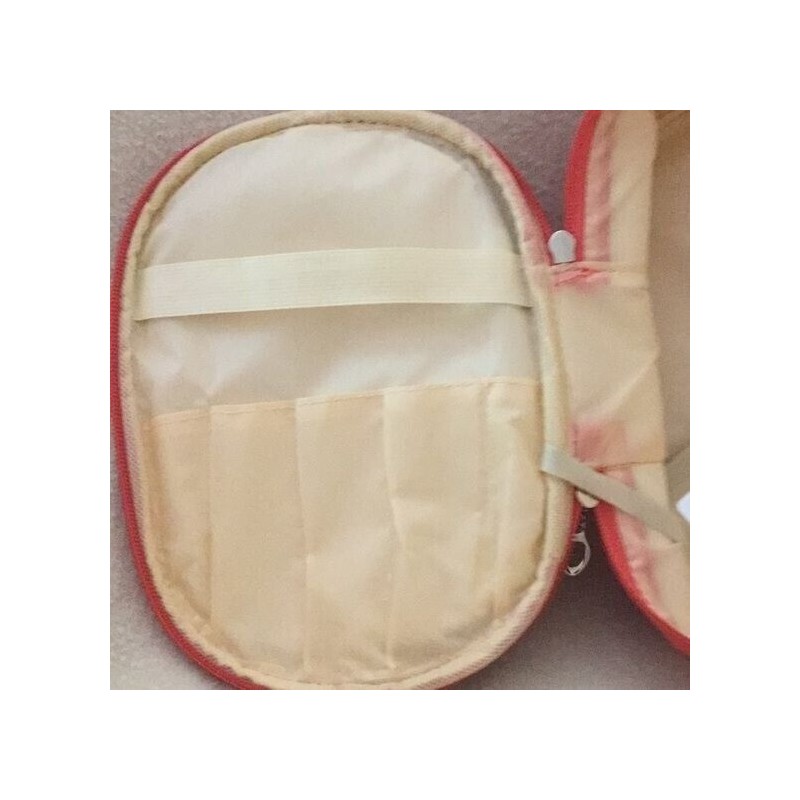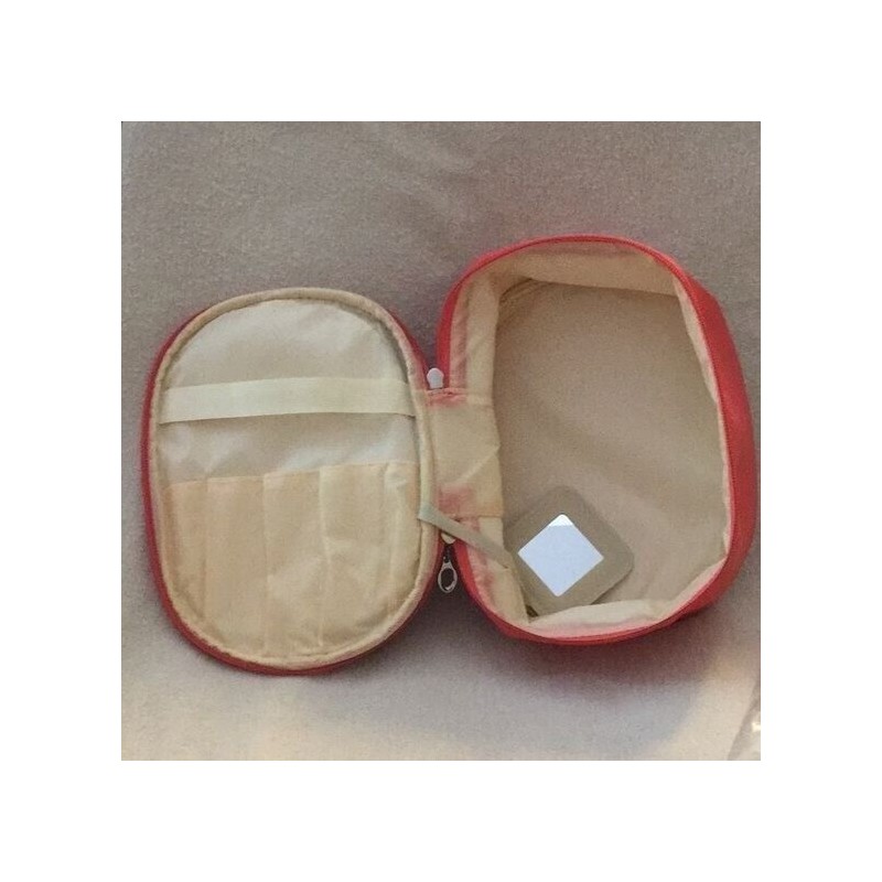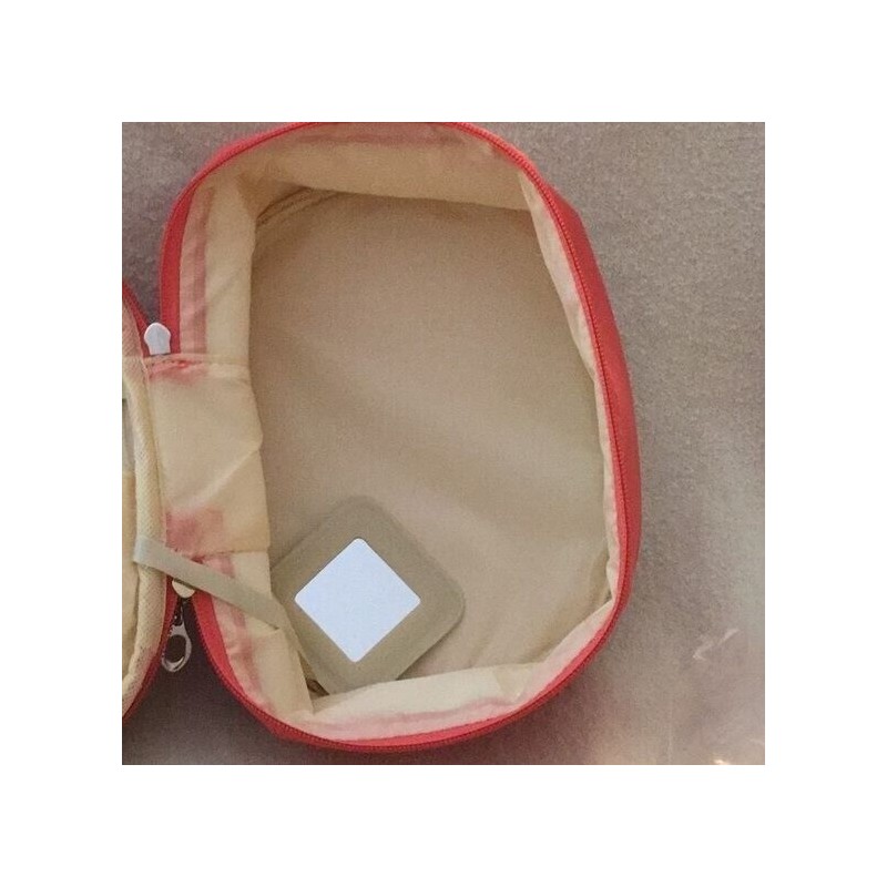 Super cute coral color makeup bag with slots for brushes in the lid and double zipper around the top for easy access. Cute little attached mirror. Measures about 9” x 7” around and 3” deep. Brand new.