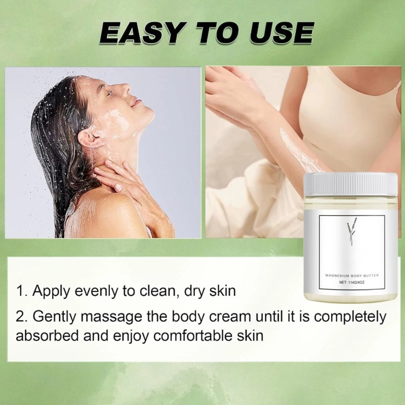 1. Use after bathing: After bathing and cleaning, take an appropriate amount of magnesium body butter on the palm of your hand while the skin is slightly damp.