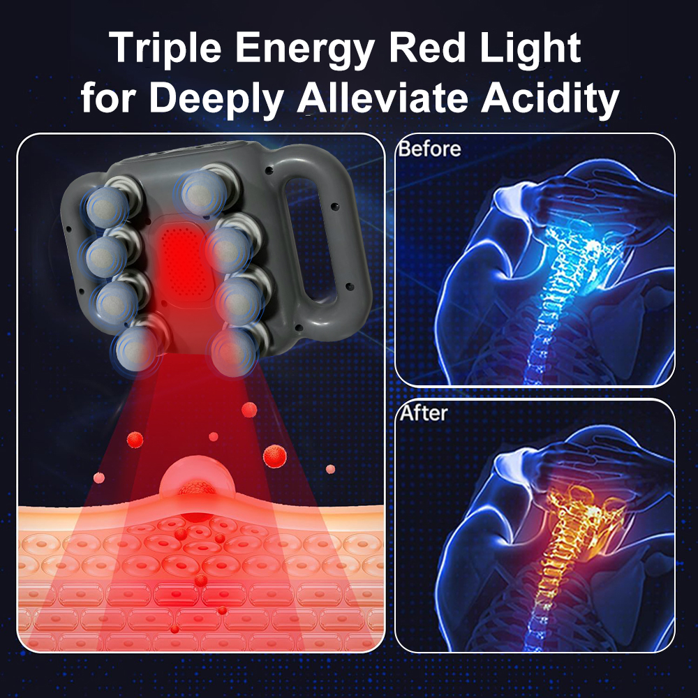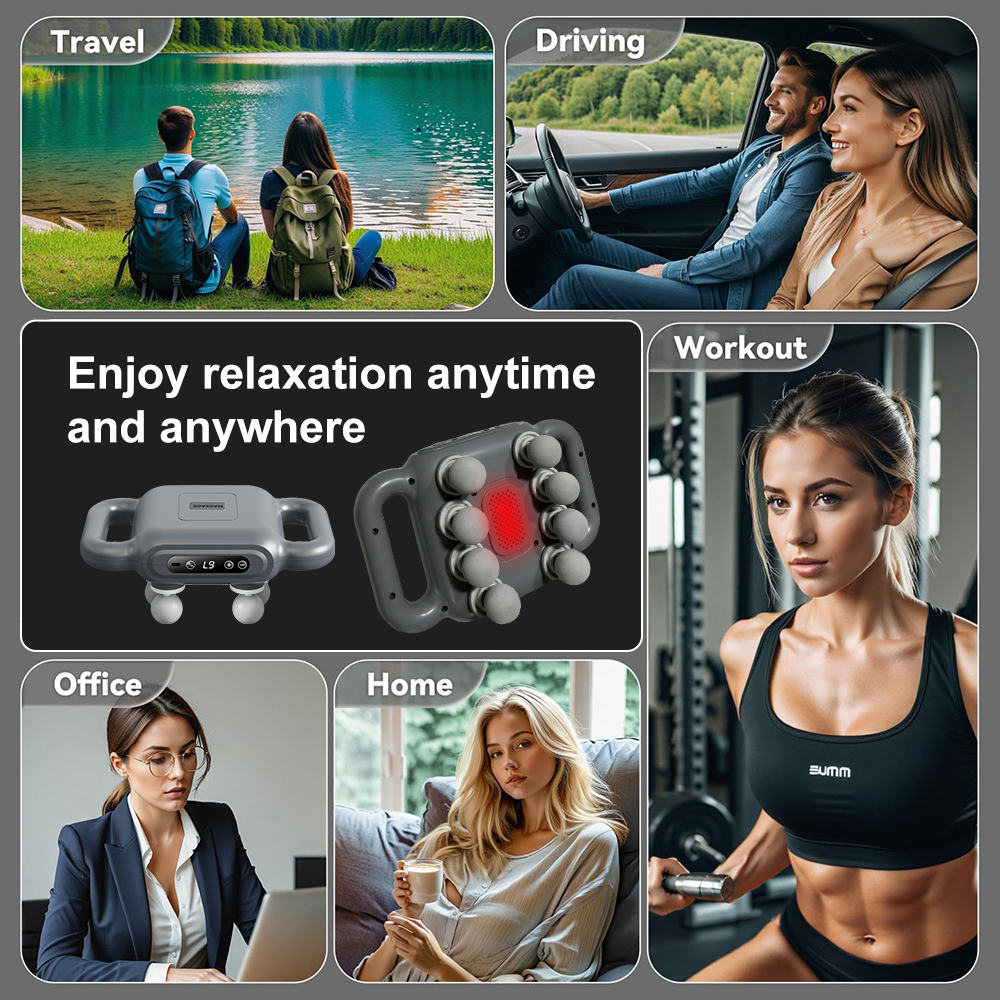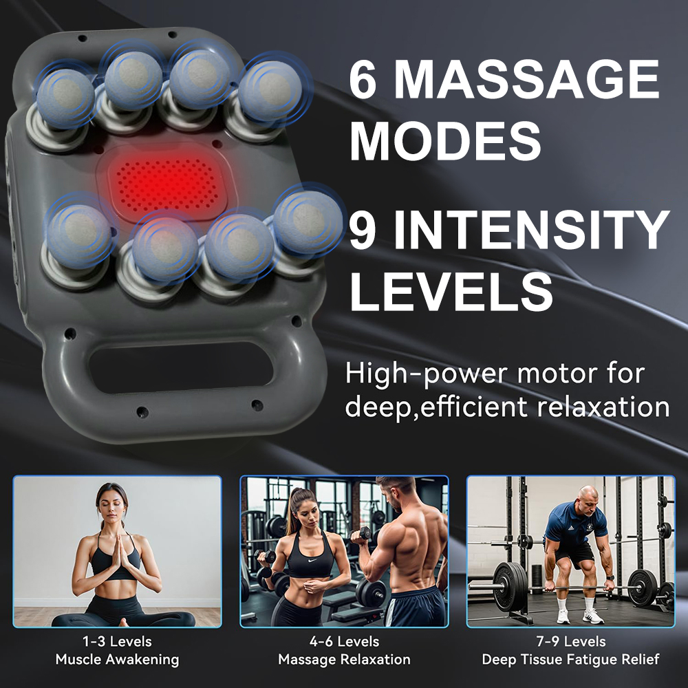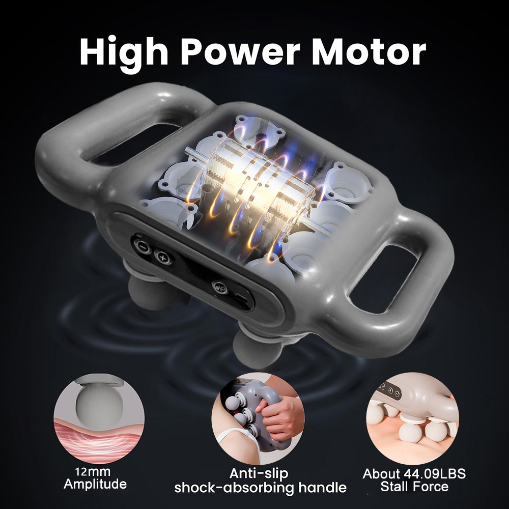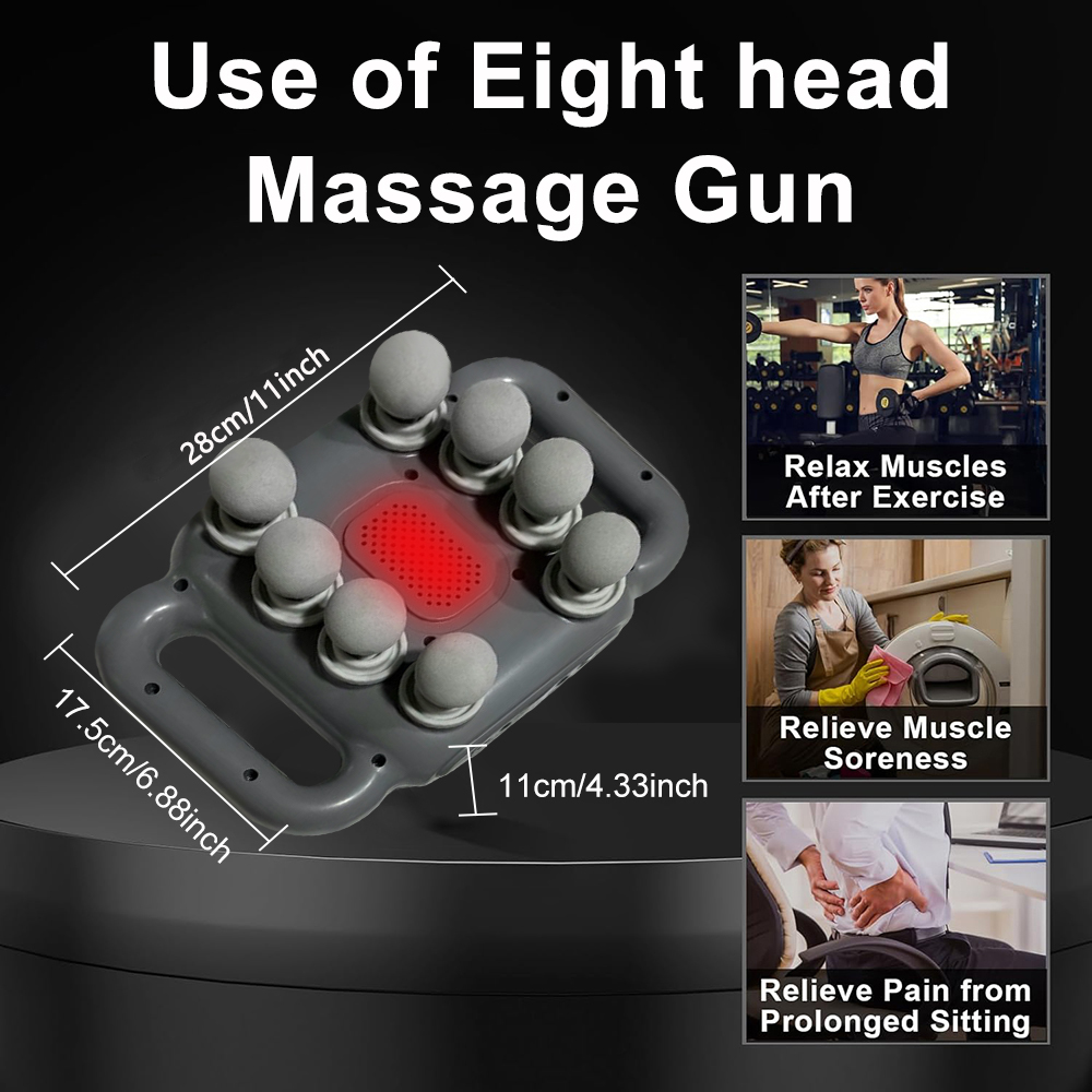 Powerful Motor & SafetyOur 8-head fascia gun featuring a double-link high-power motor that efficiently controls intensity and frequency.The deep 12mm massage reach ensures optimal muscle relaxation.An intelligent chip monitors usage to prevent over-massage, offering you a safe experience.It is very suitable for people who work, exercise or sit for long time.