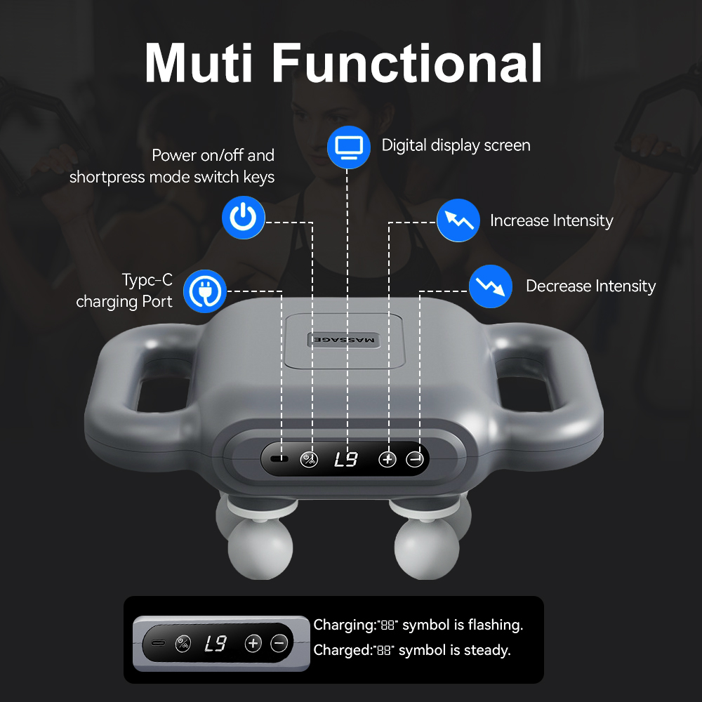 8 Massage Heads & Ergonomic Handle Design:With 8 massage heads, this fascia gun delivers a broader and deeper massage experience.The ergonomic, anti-slip, and shock-absorbing handle ensures easy grip and control, allowing you to target hard-to-reach areas like your legs, feet, back, and waist without discomfort.