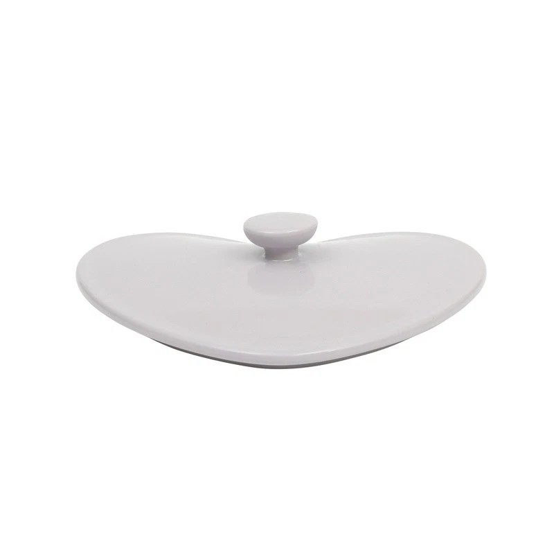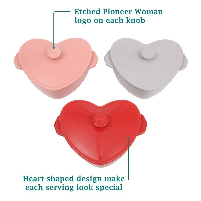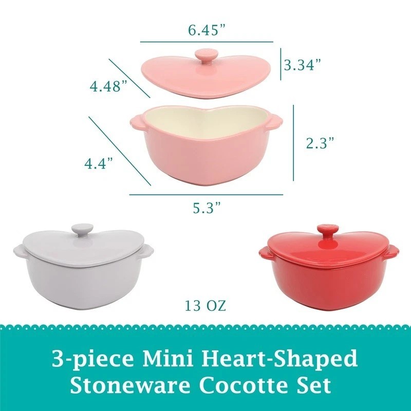 Three 13oz mini heart-shaped stoneware cocottes with lids. Each cocotte measures 5. 3 x 4. 4 x 2. 3 inches, while each lid measures 6. 45 x 4. 48 x 3. 34 inches.