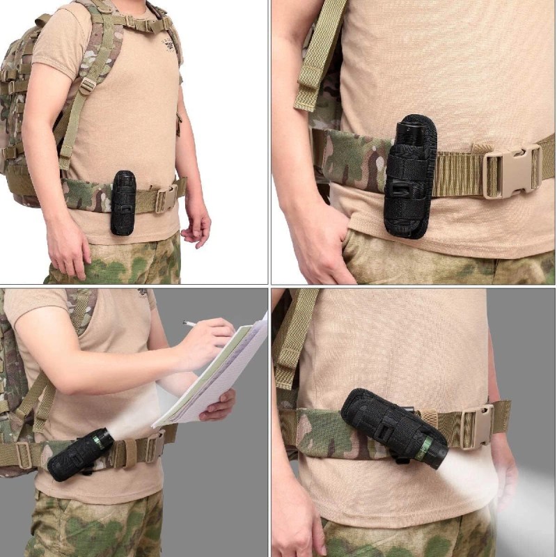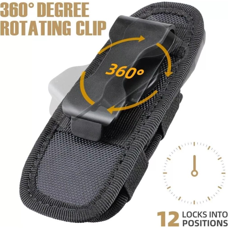 2. DURABLE ROTATING CLIP: Tactical torch pouch attach the ultra sturdy clip to your belt and allows your light to rotate 360° and lock in 8 different positions for aimable, hands-free lighting from the hip while you work.