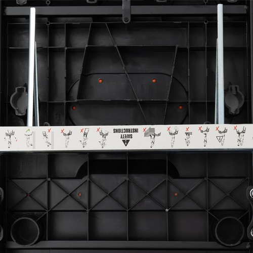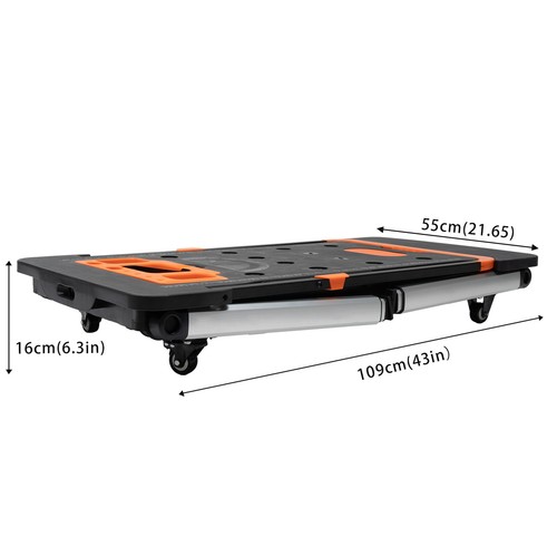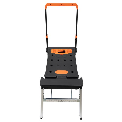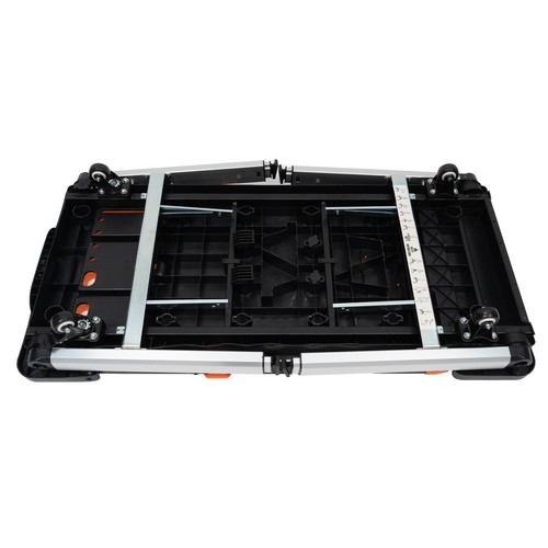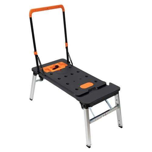 7 functions in one device: work table, sawhorse, work platform, platform, roller board, transport trolley and hand trolley.