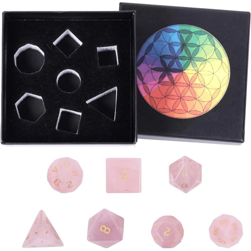Embrace the magic of roleplaying with our exquisite gem-crafted polyhedral dice. Each exquisite stone carries its own unique charm, transforming your gaming experience into an enchanting journey. Beyond gaming, the healing properties of rose quartz make these dice a beautiful addition to your collection or a stunning gift. Whether you're enhancing your tabletop experience or seeking tranquility in crystal healing, this set is designed with elegance and intention.