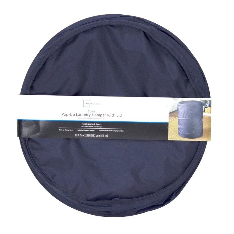 The  Navy Spiral Pop-up Laundry Hamper with Zippered Lid combines convenience and versatility in a compact design.  Perfect for dorm rooms, apartments, and smaller spaces, this hamper is easy to use and store.  It folds flat with hook-style clasps for space-saving storage and quickly pops back into shape when needed.  Made from durable polyester taffeta and reinforced with a spiral steel frame, it offers exceptional support and long-lasting durability.  The zippered lid keeps laundry secure and out of sight, making it ideal for trips to the laundromat or discreetly storing clothes.  Beyond laundry, this versatile hamper can be used to store dry cleaning, winter clothing, shoes, toys, crafts, sleeping bags, and more.