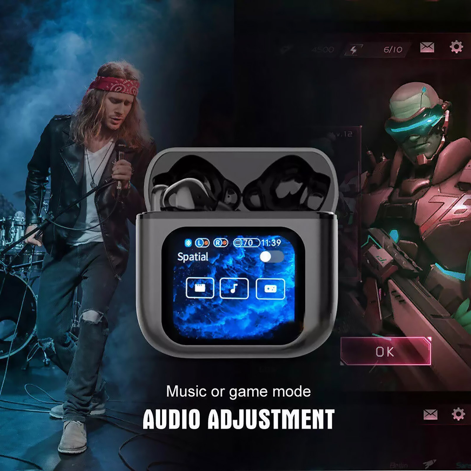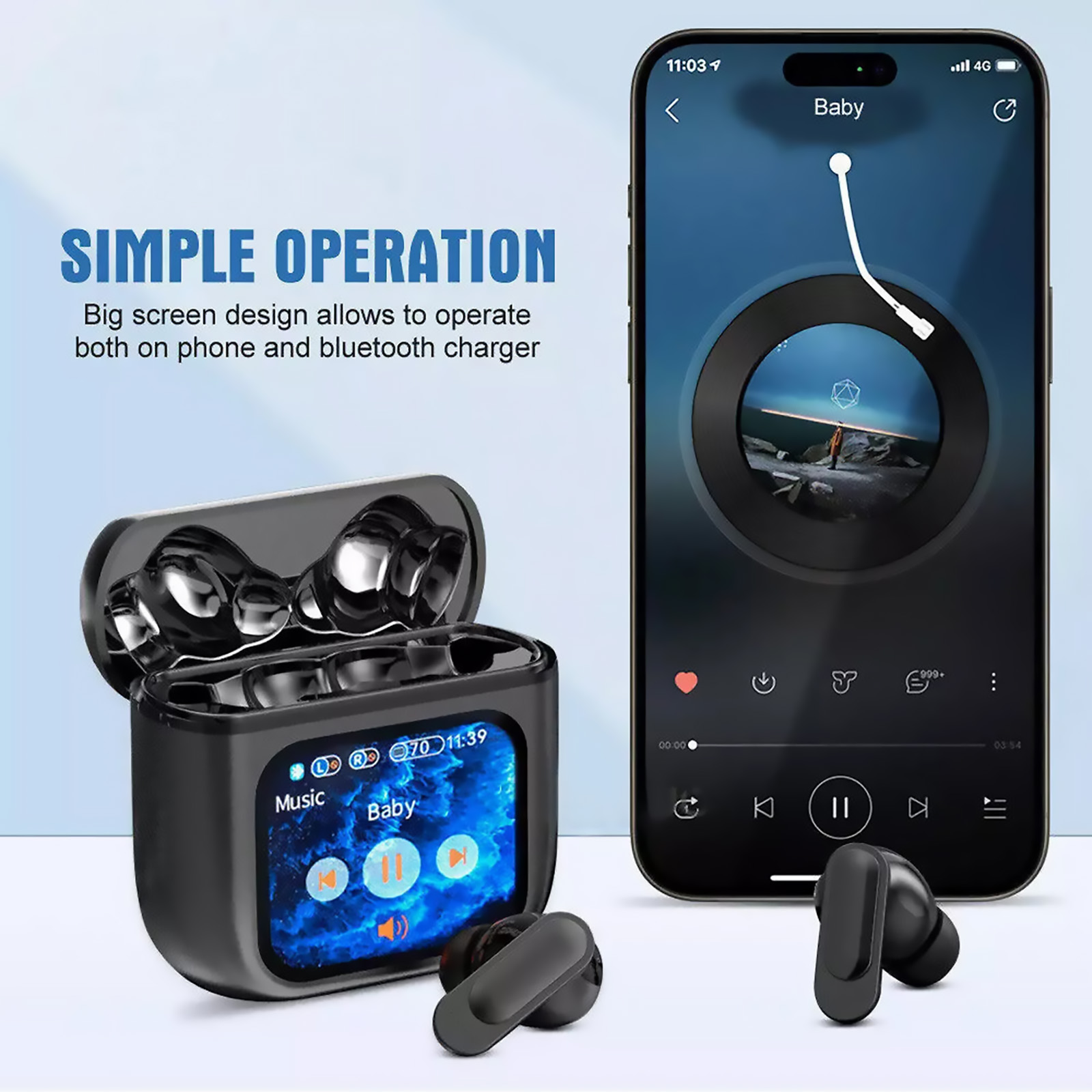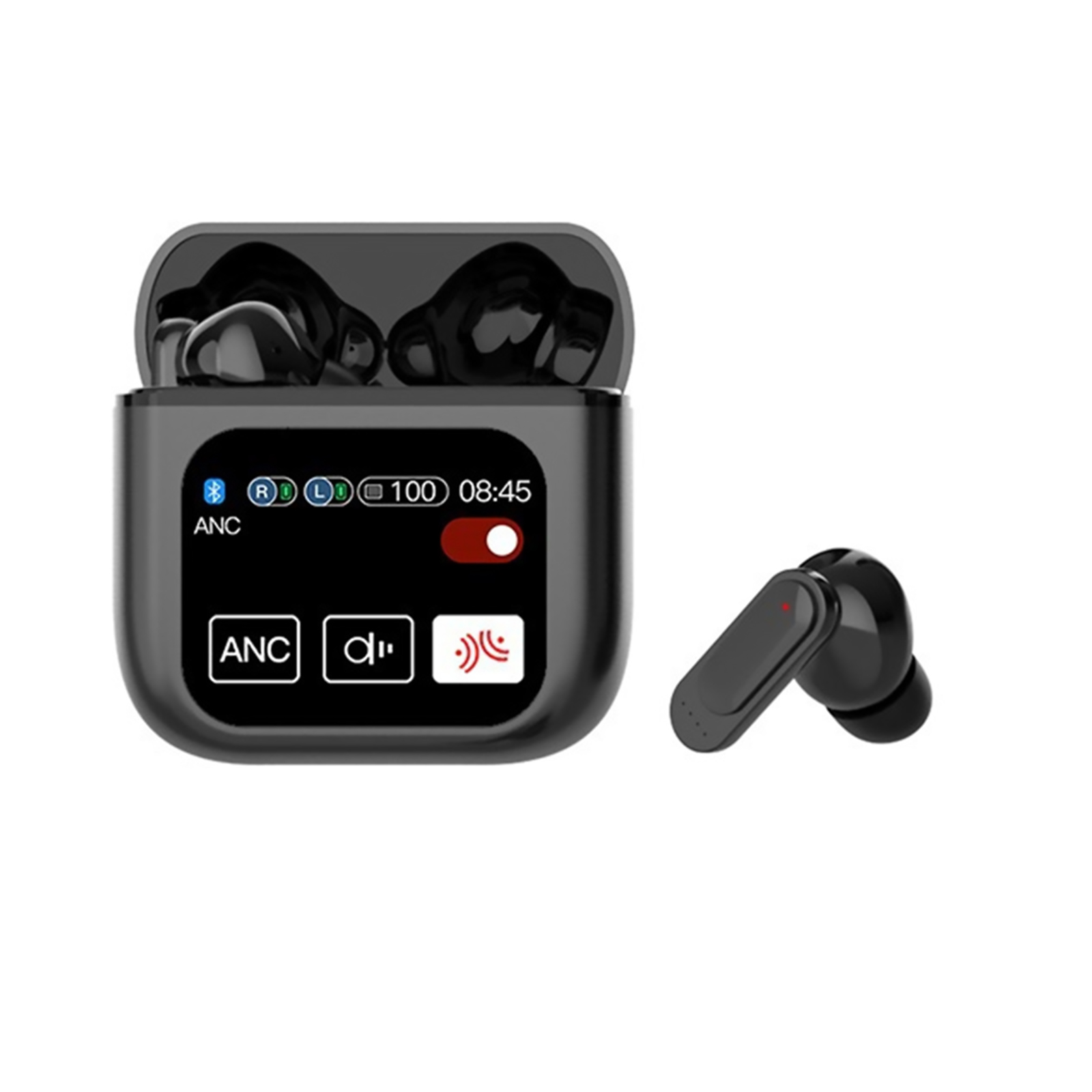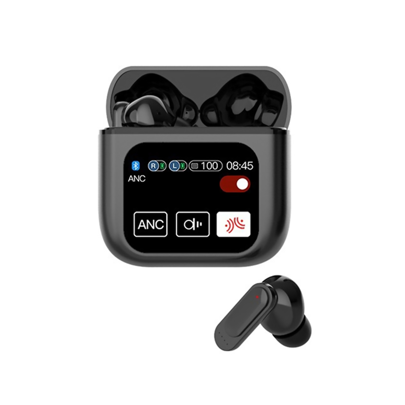 Touchscreen function, control the earbuds settings, manage calls and playback, control your audio setting and battery level and set your alarm without taking out your phone, through the screen of the charging case.
