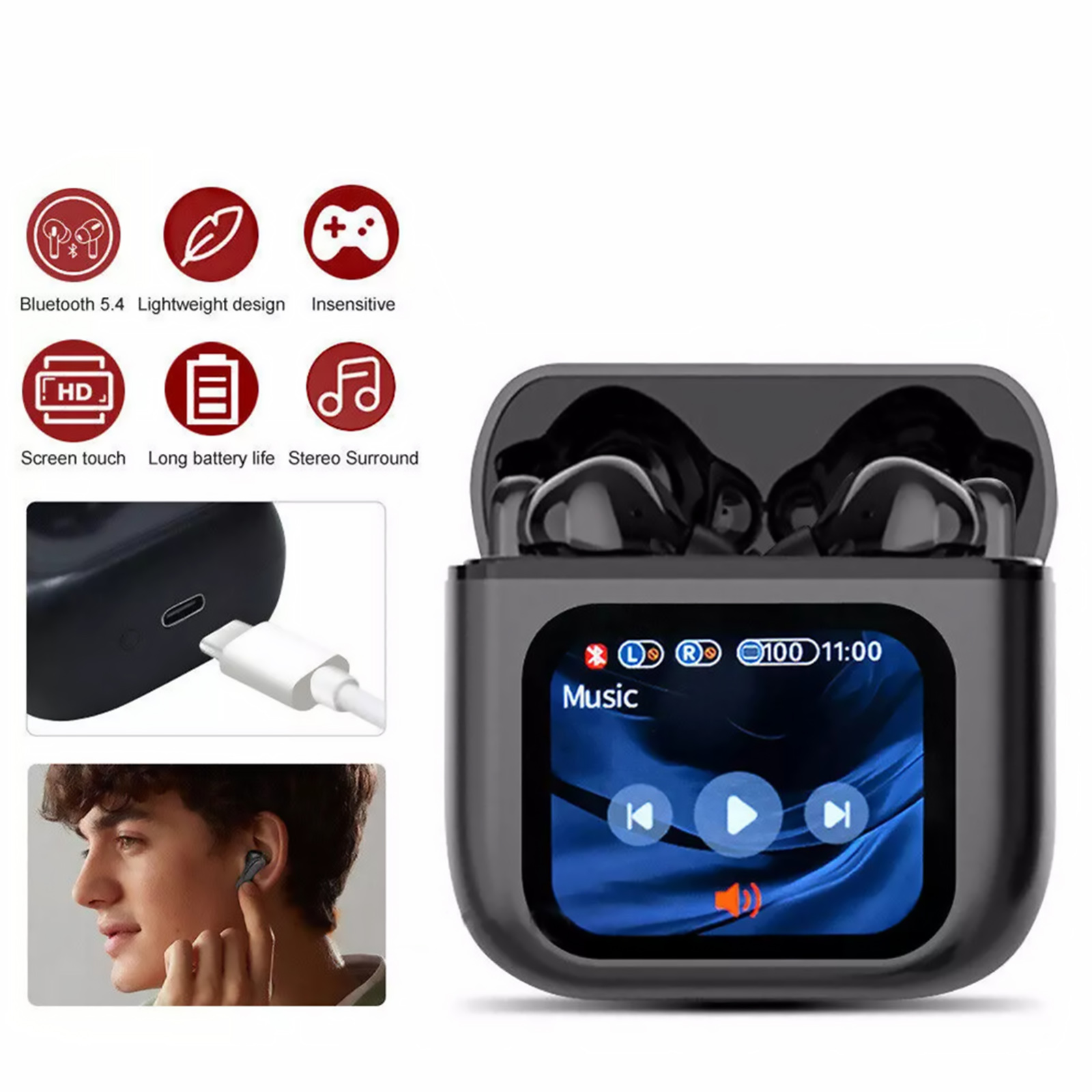 Touch screen Bluetooth headset equipped with LCD, MP3 play music, sound equalizer, multiple languages, message reminder, multi-wallpaper switch use, screen brightness adjustment, make and receive calls, voice assistant, find earbuds other kinds of functions.