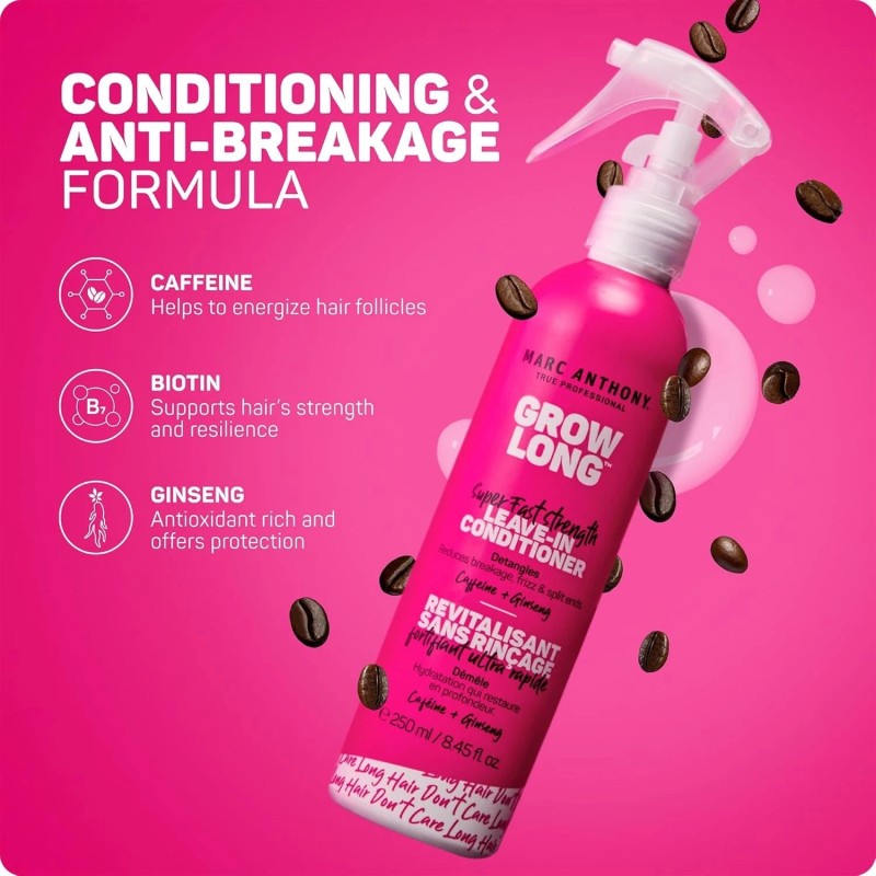 • Grow Long Super-Fast Strength Leave-In Conditioner: With Caffeine, Ginseng, and Vitamin E, this Leave-In Conditioner from Marc Anthony detangles, smooths frizz, and gives hair the strength it needs to help reduce split ends and breakage. 8.4 fl oz.