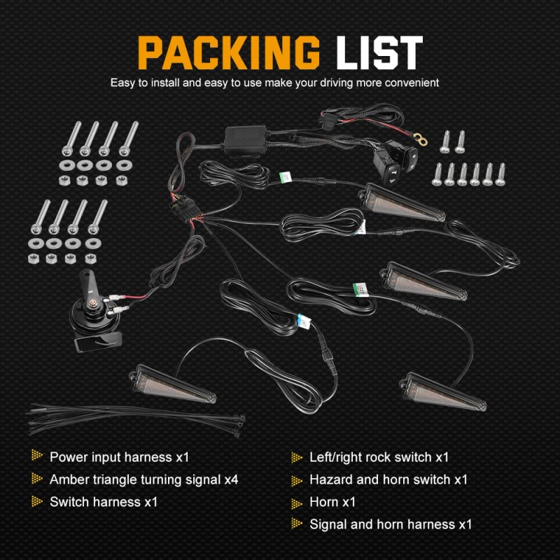 - Package Includes: The turn signal kit comes with an upgraded wire harness length that can accommodate vehicles up to 220 inches long. Color lines are marked on the corresponding installation location, making installation more efficient. The kit includes all necessary accessories, including amber turning signal lights x4, 110db horn x1, left/right rocker switch x1, hazard, horn switch x1, harness set x1, relay x1, nylon cable ties set x1, and an installation guide x1