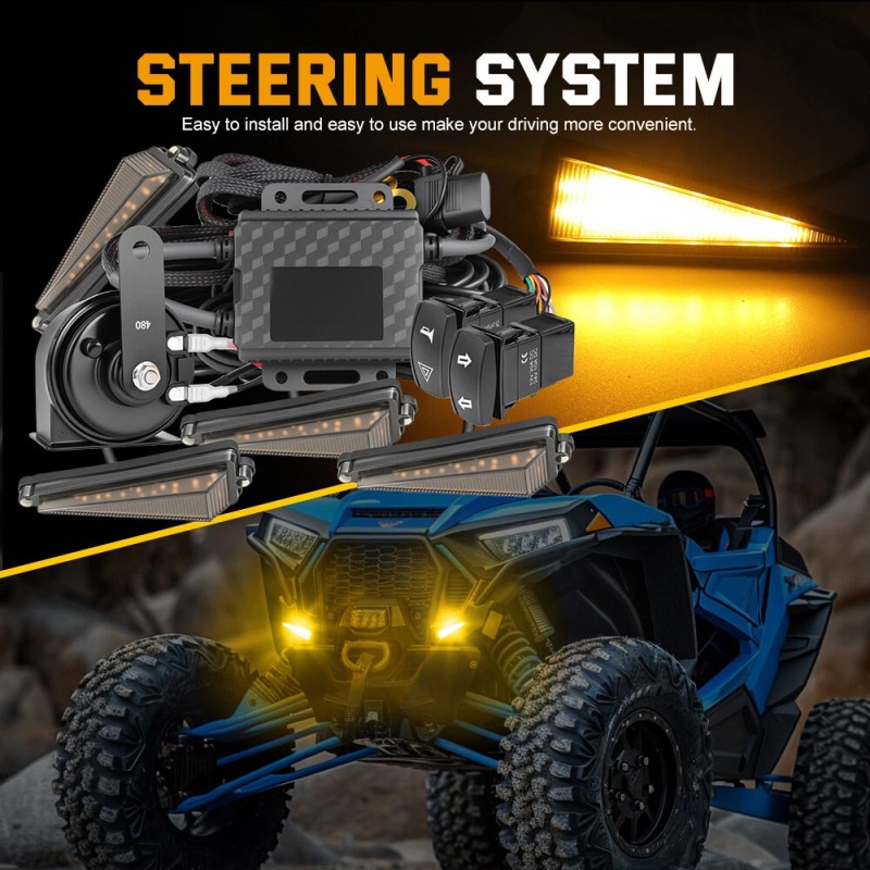 - 110dB Horn: The UTV turn signal kit features a powerful yet considerate 110dB horn designed to alert nearby vehicles and pedestrians without startling them. Its intuitive operation allows short or long presses—sound activates when pressed and stops immediately upon release. The kit includes a matching flexible switch with laser-etched LED markings for easy visibility, even in low-light conditions