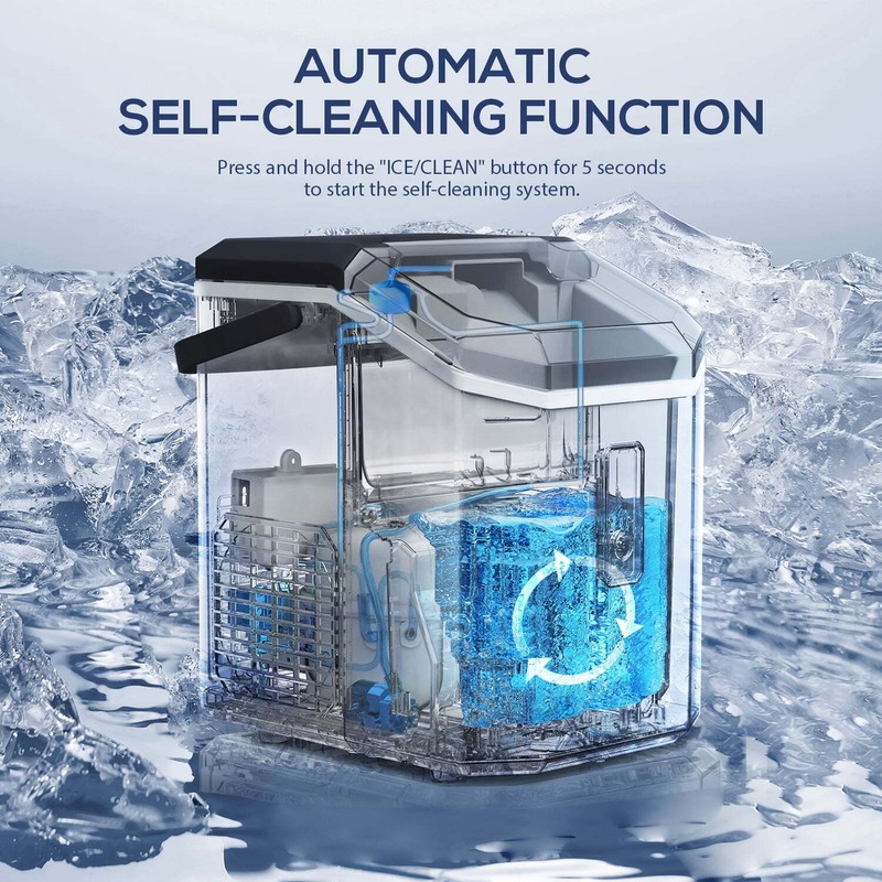 SELF-CLEANING FUNCTION: Press “ICE/CLEAN” button for 5 seconds, the ring indicator light flashes white. It will run the cleaning procedure for 15 minutes and automatically exit. Press this button again during the cleaning procedure and it will exit immediately.