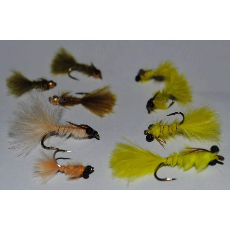 Hooks are chemically sharpened, high carbon steel, tied with premium materials such as Whiting feathers and Danville threads. Head cement used for extra durability.