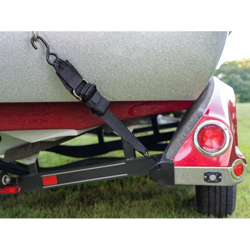 This Ozark Trail Transom Tie Down can be connected from your boat's transom to the trailer to prevent its movement and possible damage while towing. The straps are rated for a capacity of 1,200 pounds and a working load of 400 pounds. Designed with a webbed weave, these sturdy straps resist rot and the effects of oils, gasoline, and most chemicals. They are easily adjustable with buckles that allow you to extend the straps or tighten them to tie the boat securely onto the trailer, saving you time to get on the water as fast as possible! The corrosion-resistant S-hooks at both ends of the straps are vinyl-coated to prevent scratching the boat and trailer finishes. These straps are 4 feet long and 2 inches wide for use with larger trailer-able boats, but can also be adjusted to fit smaller boats. Rest assured your boat will stay sturdy on its trailer while secured with the Ozark Trail Transom Tie Down.