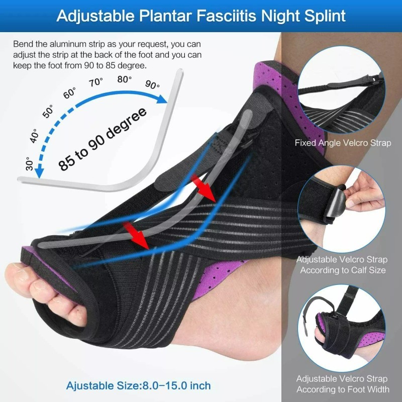 - 【Upgraded Adjustable Night Splint for Plantar Fasciitis】Firstly, we put a bendable aluminum bar inside the plantar fasciitis splint which adjustment angle is 85-90 degrees.Secondly, we designed an adjustable velcro strap on the forefoot and calf, which can be adjusted according to your size. Thirdly, there is a fixed and adjustable velcro strap between the calf and sole of the foot. In a words, the night splint for plantar fasciitis can be customized according to the size of each person's feet.