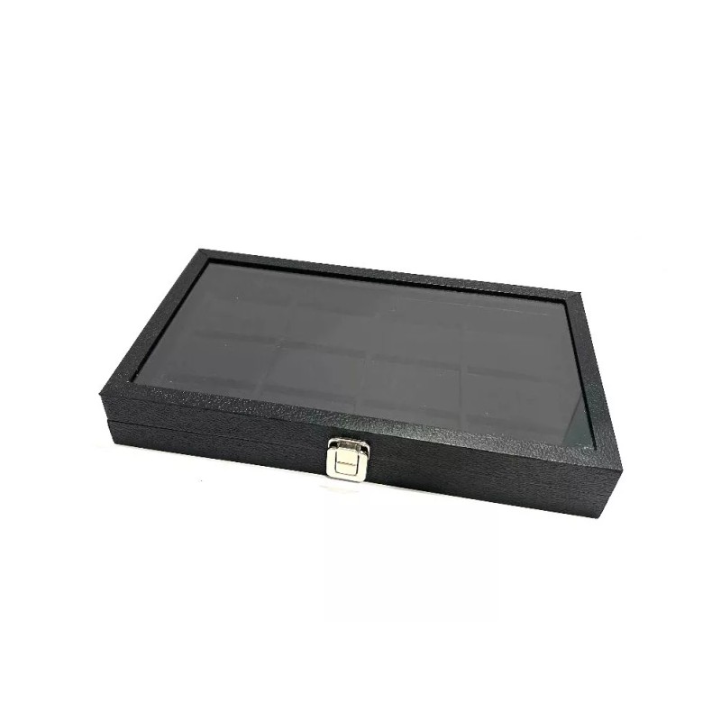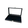 Pocket watches black grained leatherette glass top display case with black 12 space insert.