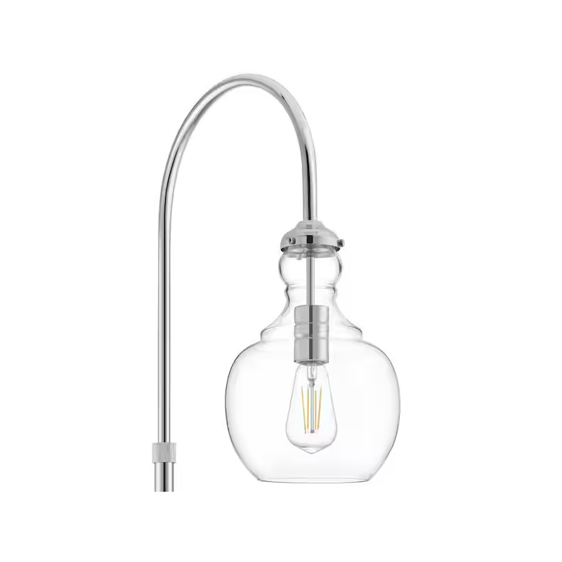- The polished nickel finish exudes elegance, while the curving arc of the body and globe-shaped clear glass shade add a touch of sophistication to any space.