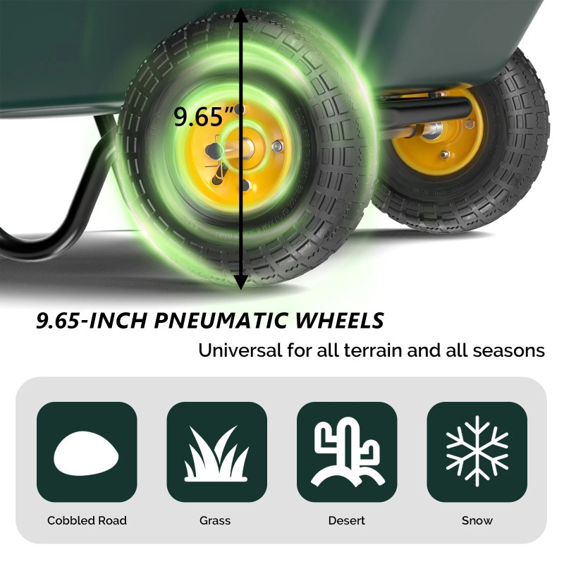 2. Heavy-Duty 300 lb Load Capacity: Built with a reinforced poly tub and sturdy steel frame, this cart easily hauls soil, mulch, firewood, tools, and more—perfect for any garden or landscaping project.
