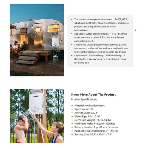 This Propane Water Heater brings you a convenient and safe outdoor shower while being both efficient and energy-saving. CSA-approved heater safety meets both Canadian and US Standards and will build a safe wonderland of showering for you and your family, your pets, your cars, and even your boats.