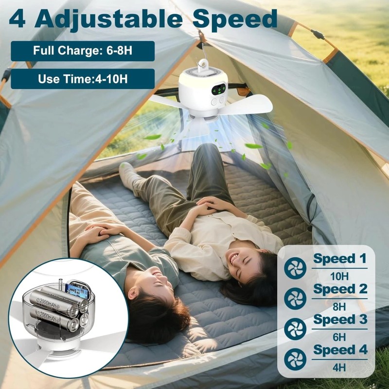- 【Timable & Auto Shut Off】This camping fan has 4 modes for timing: 2/4/6/8 hours, so that it will turn off, worry-free at night sleep. Simple installation within 10s