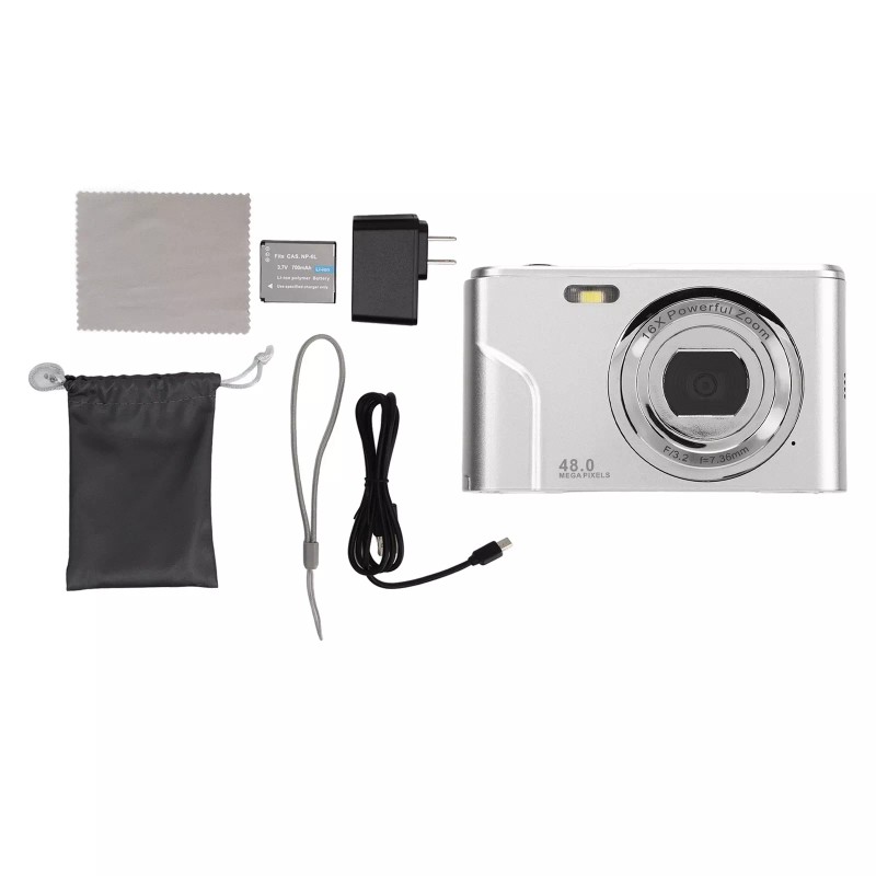 Feature: 1. High Definition: Digital camera can shoot 48 megapixel photos, 1080P video output, ultra clear images, rich and vivid details, accurate color reproduction, support for 16x digital zoom.2. Easy to Operate: Portable digital camera supports automatic light sensitivity, adaptive shooting mode, electronic stabilization, no cumbersome settings, easy to get started, just press the shutter to take pictures of beginner can also shoot a blockbuster. 3. 2.4 inch IPS display: Digital camera with high definition 2.4 inch IPS display, scratch resistant and wear resistant at the same time, can also clearly display the current shooting content, easy to operate. 4. Auto Focus: The portable digital camera supports portrait smile face catch, auto beauty, and with the auto focus function, there is no need to manually focus, the camera is always on standby, not missing any wonderful life moments. 5. Long Battery Life, Application: Mini compact pocket camera with a large battery to ensure sufficient power to meet a variety of applications, suitable for travel, friends, graduation, wedding ceremonies, growth records, etc. 6. Small Size, Ideal Gifts: Pocket camera is thin and light, one handed, can easily fit in your pocket, rich personalized colors, you can show your unique charm, more as a gift to your friends and family. Specification: Item Type: Digital Camera Material: ABS File Format: JPG, AVI Image Resolution: 48M; 44M; 36M; 24M; 20M; 16M; 12M; 10M; 7M; 5M; ; 2M Automatic Shutdown: 3/5/10 minutes Video Resolution: 1080P; 720P; 480P Image Ratio: 16:9 Zoom Magnification: 16 Times Digital Zoom Sensitive Component: 8 Million COMS White Balance: Automatic Focal Length: f=7.36mm Autofocus: Support Battery Type: Lithium Ion Battery Number of Batteries: 1 Battery Model: NP 6L Battery Capacity: 700 mAh (Shipped with Matching Battery) Storage Support: Can Support Up to 256G Memory Card (Memory Card is Not Included) Supplementary Light: Support Menu Language: English, German, French, Spanish, Italian, Turkish, Russian, Portuguese, Dutch, Simplified Chinese, Traditional Chinese, Japanese, Polish Length of Use: 150 Minutes of Photography, Video 90 Minutes Auto Power Off: 1 Minute, 3 Minutes, 5 Minutes, No Shutdown Charging Interface: Type C Charging Power: 5V 1A Display Screen: 2.4 inch IPS Screen, 16:9 WiFi Connection: Not Supported Package List: 1 x Digital Camera 1 x Instruction Manual 1 x Charging Plug 1 x Charging Cable 1 x Storage Bag 1 x Wrist Strap 1 x Cleaning Cloth 1 x Battery