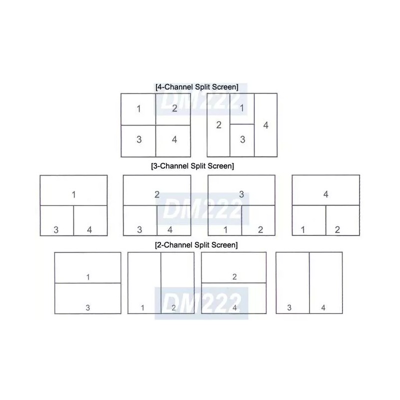 - Supports total 7 screen modes including 4-channel split, 3-channel split, 2-channel split, 1-channel full-screen and auto sequence.