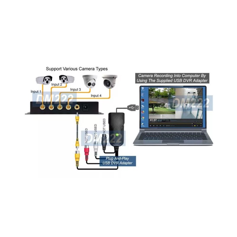 - Stand alone quad video processor bundled with a plug-and-play USB DVR adapter for recording use in Win10, Win8/8.1, Win7, XP and Mac OS.