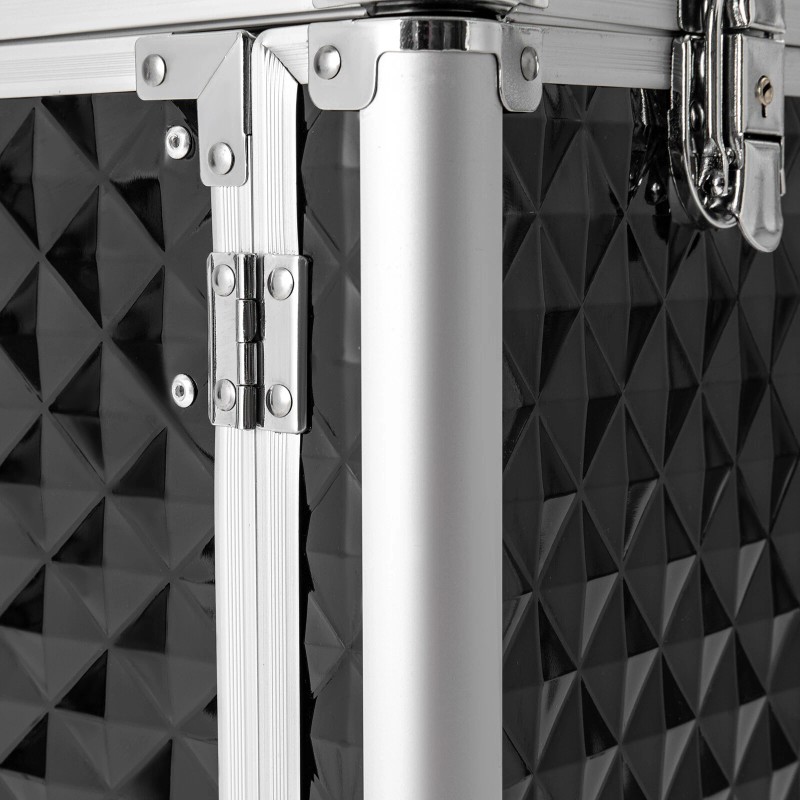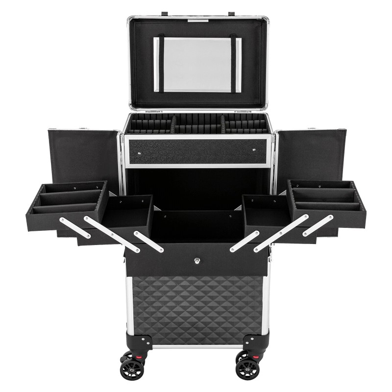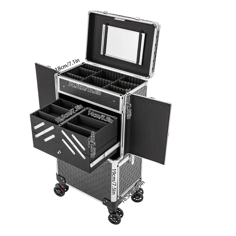 Are you still worried about too many cosmetics and inconvenient to carry? Then take a look at our rolling makeup case. It is made of high-quality medium fiberboard and ABS and features foldable storage with multiple tiers, fully meeting needs. It will become an ideal purchase for every beauty girl, make-up artist, and hairstylist.