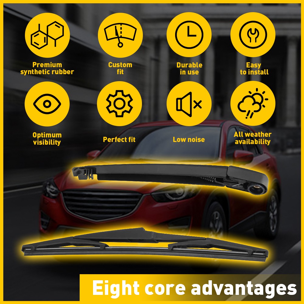 *Function It provides a clear rear view to ensure driving safety, especially on rainy days. The wiper system is tested and adjusted to contact the back glass perfectly. *High Strength Spring High-strength, high-pressure springs are upgraded from ordinary products, and the blades are pressed to fit perfectly into the vehicle. *Moving freely There is enough space for the wiper feeding claw to move up and down a little, and the position can be self-adjusted according to different situations. *Long service life Rear wiper blades are made of wear-resistant natural rubber to ensure smooth and quiet operation, and wiping the edges with special coatings can help extend its service life.