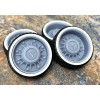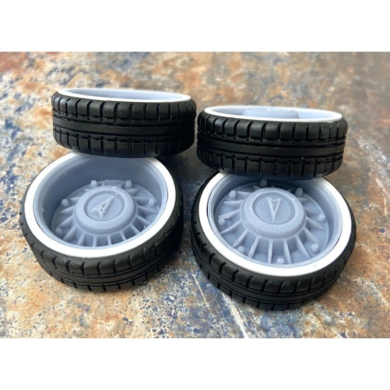 Resin wheels and tires for a 1/24 or 1/25 scale model car.