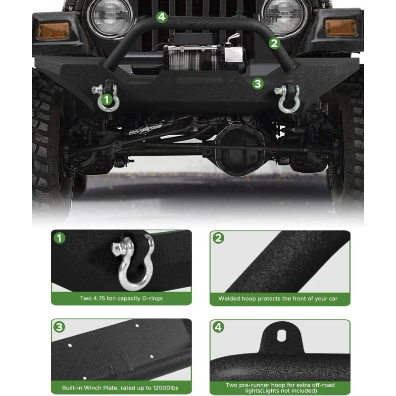 • Off Road Components: The carbon steel front bumper for Jeep Wrangler TJ YJ comes with a 4.74 ton D-ring and a winch position that supports up to 12,000 lbs of winch, making it easy to rescue your vehicle when it's in trouble.Also pre-drilled work light mounting holes (work light not included)