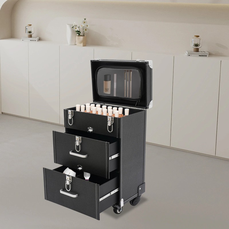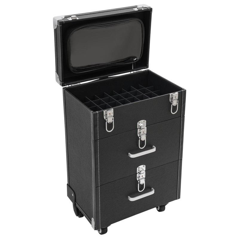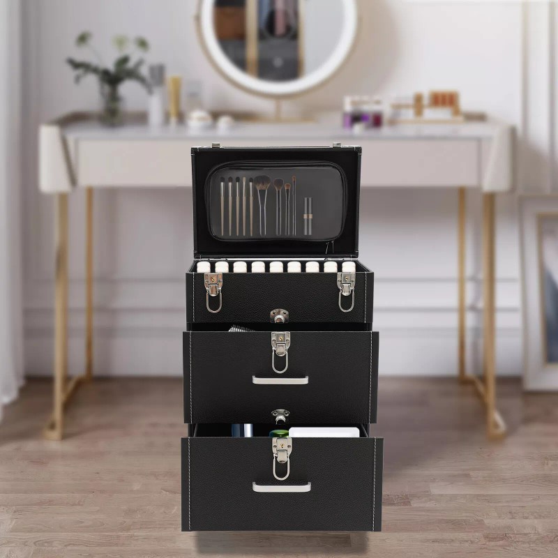 Description A good makeup case is essential for makeup artists. The rolling makeup case is made of high-quality materials, sturdy and durable. The large capacity design allows you to partition and store different cosmetics, hair tools, and more. With the minimalist style, universal wheels, retractable pull rod, and comfortable handles, it makes your make-up work more convenient! Key Features Premium Materials: This product is made of high-quality PVC and aluminum alloy, which is corrosion-resistant, wear-resistant, and not easy to fade, ensuring a long service life. Large Capacity: The two drawers at the bottom allow you to store curling irons, hair dryers and other large items, The large compartment with 45 slots makes it easy to store nail polishes and lipsticks, it is also removable
