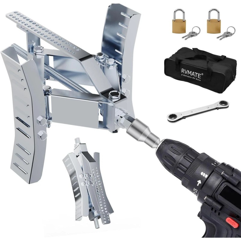 🚩【CARRYING & STORAGE】The product with a handle and a free storage bag is easy to store and carry. The package also includes a ratchet wrench and 2 locks. The locks can prevent others from jokingly removing the wheel chock to avoid the RV slipping down and causing damage.