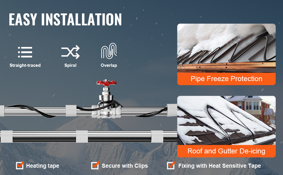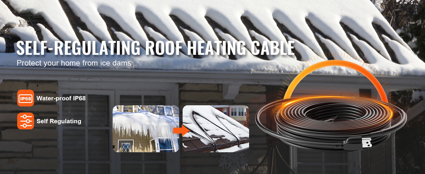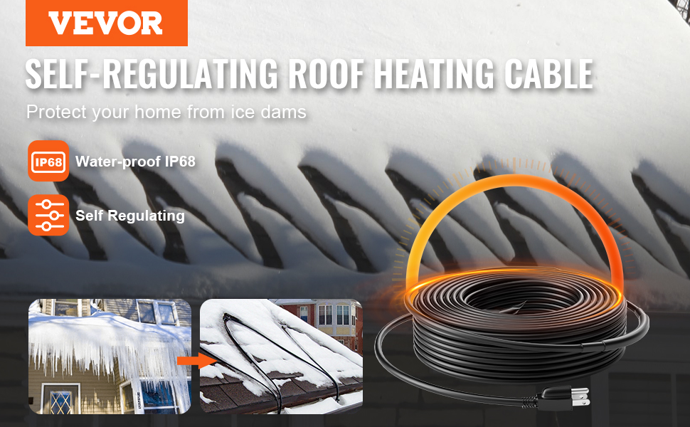 - Beat the Winter: Treat your pipes and roof right and stand up to the harshest winters. Our self-regulating pipe heating cable with 6FT power cord is designed to prevent ice dams from forming on roofs, downspouts, and in gutters. Protect your roof from damage and leaks. and keep the water flowing in the gutters and downspouts continuously.