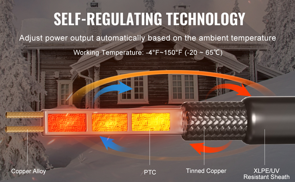 - Self-regulating Technology: This 120FT self-regulating heating cable for roof and gutter automatically adjust heat output to ambient temperatures, reducing energy costs effectively. No need to worry about overheating or freezing! Max self-regulating temperature: 150 °F/65℃.